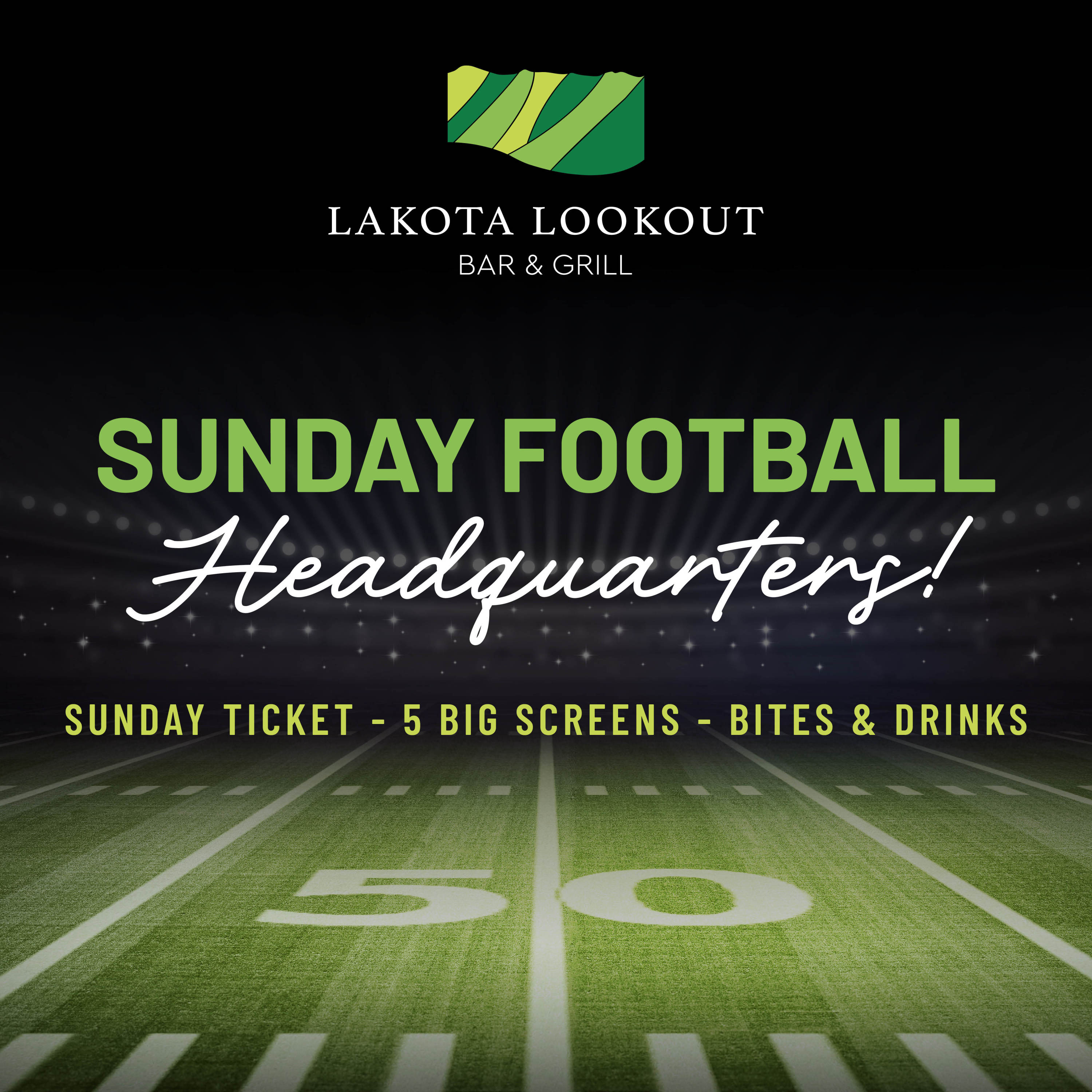 Kick back and make it the perfect game day with Football Sundays at the Lakota Lookout Bar & Grill! Enjoy food, drinks, and catch the games on our 5 big screen TVs.Images